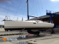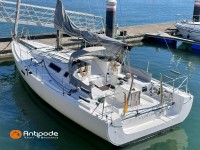 • POGO 1050, 2010, first hand, VOLVO D1-20F, 19 hp (945 hrs), Interior layout : 1 forward open cabin, 1 aft cabin, Large storage and head / toilet in aft starboard with extra opening hatch, 2 cockpit primary genoa winches - Harken 46ST, 2 roof winches for adjustment and sail handling - Harken 40ST, Winch for mainsail sheet in cockpit - HARKEN 20ST, Cockpit mounted main sheet traveller, Winches covers (all of them), Carbon retractable and removable bowsprit, Grey Batyline cockpit folders, Tiller + extension + covers, Cockpit sprayhood (2022), Electric windlass, Carbon mast, Dyform cable standing rigging, Full batten main sail, Hydranet, triradial cut, 3 reefes - Incidences Sails, Main sail lazy jacks, Main sail classic cover, Genoa roller furling with above deck drum - Facnor Flatdeck - Facnor RC180, Furling genoa, Hydranet - Incidences Sails, Genoa anti-UV protection cover - Incidence Sails (2022), Releasable Dyneema baby-stay and hardware, Jib for releasable baby stay, Hydranet, 1 reef - Hydranet Sails, Deck bag for releasable reef, Assymetric spinnaker riggings, Asymmetric spinnaker (Runner), 122Sqm - Incidence Sails, Furlable gennaker, Stormlite 150g - Hydranet Sails, Spinnaker snuffer, Gennaker furler - Facnor FX2500 PC, Adjustable twin backstay, In board autopilot - NKE, Autopilot remote control, True wind mode, Navigation system - NKE, Cockpit repeaters - NKE Multigraphic & TL25, GPS - Furuno GP32, DSC AIS VHF at chart table - Navicom RT650, Second wireless VHF unit, Fridge unit 12 V (top opening door), Water heater 220 V and engine heat exchanger, 220 V shore power + battery charger - Mastervolt 25A, Engine battery, 2 x Service batteries - Bosch 2 x 74Ah (2022), Battery controller - NKE200A, Holding tank - 55L, Liferaft, 1st owner, never chartered, only coastal cruising, Located Spain, For more information or to make an appointment for a visit, contact : Jean-Baptiste Lemaire +33 6 10 25 00 03 - jb@antipode-yachts.com